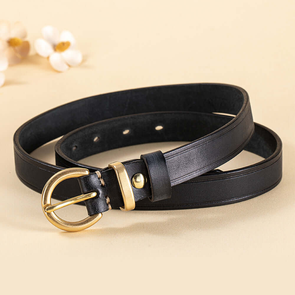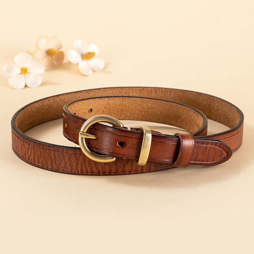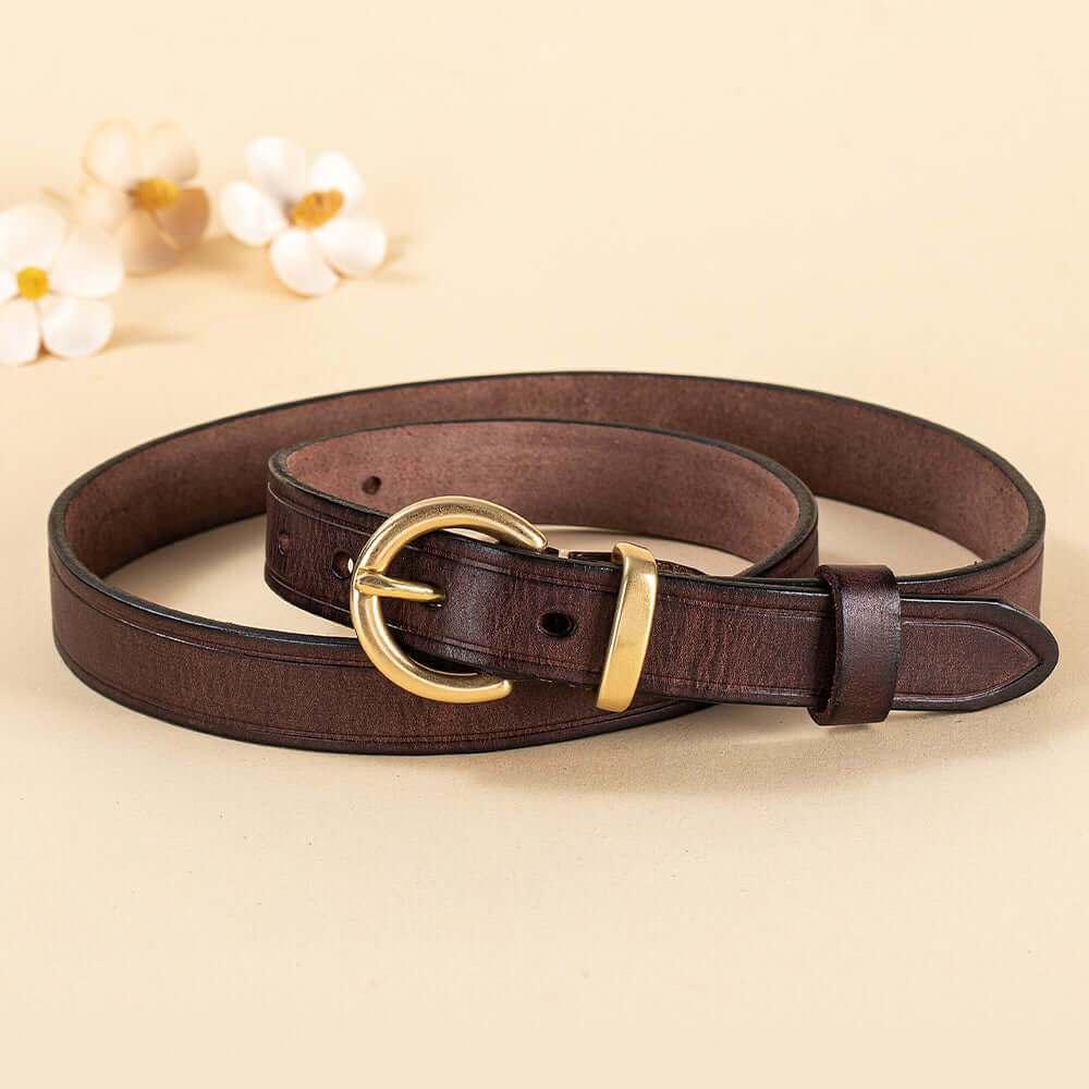 Crafted from premium vegetable-tanned full-grain leather, this women’s genuine leather belt features a timeless antique gold buckle and classic pin-hole design. Durable, stylish and easy to adjust, it’s the perfect everyday belt for jeans, dresses or trousers.